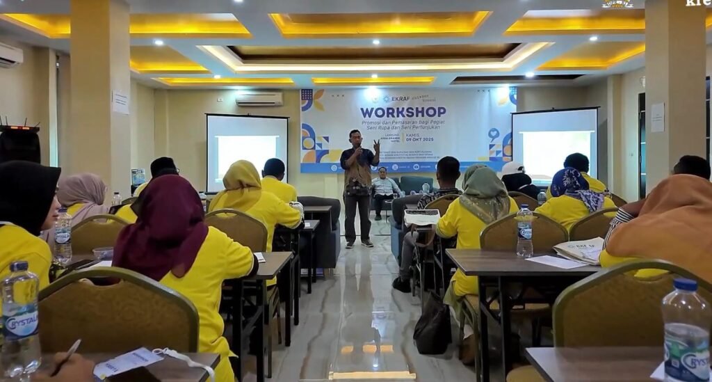 Metro — Di tengah derasnya arus digital dan kompetisi dunia kreatif yang semakin ketat, seniman tak lagi cukup hanya mahir berkarya. Mereka juga dituntut mampu memasarkan hasil ciptaannya agar dikenal luas dan bernilai ekonomi. Menyadari pentingnya hal itu, Kementerian Ekonomi Kreatif (EKRAF) menggelar Workshop Promosi dan Pemasaran Seni di Idea Metro Creative Space, Kota Metro, dengan menghadirkan Solihin Utjok, pendiri Komunitas Ruang Pojok, sebagai narasumber utama.